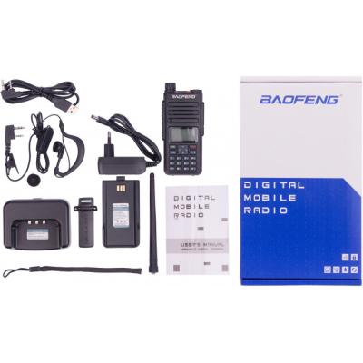 Рация Baofeng может работать как в диапазоне частот 400-470 МГц так и 136-174 МГц.<ul><li>Емкость аккумулятора: 2200 мА*ч</li><li>Частота приёма и передачи: 136-174 МГц / 400-470 МГц</li><li>Частота FM приёма радио: 65.0 МГц-108.0 МГц</li><li>Режимы модуляции: FM (аналоговый), DMR (цифровой)</li><li>Возможность работы с рациями Motorolla и некоторыми другими DMR цифровыми рациями</li><li>Возможность работы с цифровыми ретрансляторами (стандарт DMS Tier 2)</li><li>Групповой вызов собеседников, индивидуальный вызов, общий вызов всех абонентов, отправка СМС сообщений</li><li>Цифровое шифрование голоса AMBE+2</li><li>Независимая работа двух каналов: А / В</li><li>Шаг частотной сетки: 2.5/5/10/12.5/20/25/50 КГц</li><li>Одна клавиша PTT</li><li>Выбор режима: узкополосный или широкополосный (25 КГц / 12.5 КГц)</li><li>Отображение на дисплее канального или частотного режима</li><li>50 групп CTСSS / 104 группы DSC кодов</li><li>Поддержка DTMF (тоновые сигналы)</li><li>2-х частотный дисплей</li><li>Режим экономии энергии аккумулятора</li><li>Высокий / Низкий уровень мощности</li><li>Звуковой сигнал при нажатии кнопок</li><li>Тоновая посылка для работы через репитор 1750 Гц</li><li>Сканирование каналов</li><li>Возможность общения с обычными канальными станциями LPD диапазона</li><li>Подсветка ЖК дисплея и клавиатуры</li><li>Блокировка клавиатуры</li><li>Программирование с ПК</li><li>FM-радиоприемник (65-108 МГц)</li><li>Тип разъема антенны: SMA Female</li><li>Диапазон рабочих температур: -20 ~ +60 °C</li><li>Пыле и влагозащищённость по стандарту IP54</li><li>Радиус действия: до 16 км (в зависимости от местности и условий использования)</li></ul>